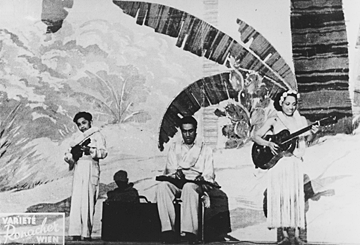 The outbreak of WWII forced them to flee Europe entirely. They settled briefly in Lebanon, but thern Italy declared war there. They worked their way further east in the Middle East, boarding a ship at Bagdhad in the hope of going home to Hawaii. However, Pearl Harbor had just been bombed and the Pacific Ocean was closed for travel, so the Moe family settled in India for the rest of the war years. Tau organized bands and orchestras for the top hotels in the major cities of India, employing a multi national group of musicians, all on the move because of the war. He would transcribe for performance the latest songs from musical films, watching the films several times in order to write down the melodies, chords, and words. Daughter Dorian was born in 1945 and soon was part of the act: dancing, singing, and later playing the guitar. In the late 1940s, after many engagements in principle Indian cities, the Moe family returned to Europe.
