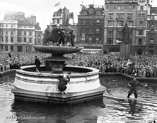 Outside London's Rainbow Corner Club, American servicemen and women wave headlines declaring peace on August 15, 1945. Nazi Germany had already surrendered in May.
